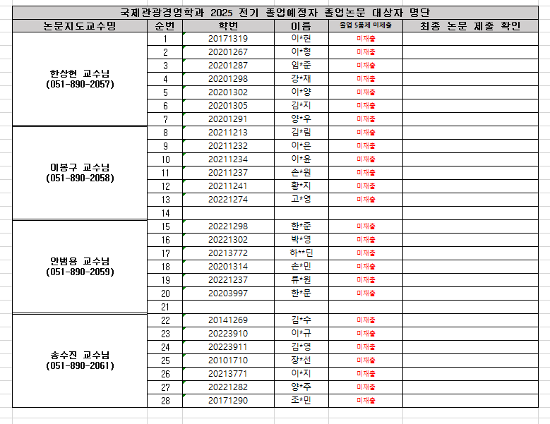 ※ 복수전공생의 경우 졸업시험 및 졸업논문작성 대상 관련 문의는 (국제관광경영학과사무실: 051-890-2094 / 월~금 09:00~17:00)